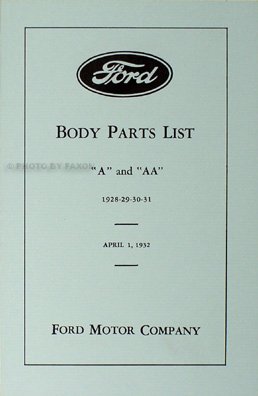 "Ford Body Parts List 'A' and 'AA' 1928-29-30-31." This is a reproduction of the book that originally would have been used in the Ford dealer's parts department so that customers could order parts. You will find the original part numbers, which are still useful today because many parts vendors still use Ford's numbers to keep track of their parts. Use this book to make your search for parts both quicker and easier. Find out if the parts on your car and the parts you are buying are original and complete. 246 pages, 50 illustrations. Covers 28, 1929, 1930, and 1931. Buy now to own this factory body information.